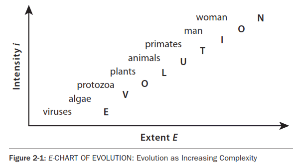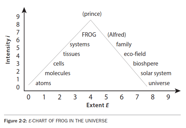 This chart refers to the comparative complexity of living organisms. (For further explanation of complexity see Murray *Gell-Mann's THE *QUARK AND THE JAGUAR. and also the periodical *JOURNAL OF COMPLEXITY.) Notice that i refers to integration, perhaps measures of life process such as the exchange of nutrients, messenger molecules or nerve impulses. E refers to the number of subsystems such as cells. Notice that this E chart does not describe evolution in time, but rather compares the evolving complexity of life. with branching chains showing diversification and extinction as found in basic biology texts. It focuses on evolution by simply using to illustrate increasing complexity. The reader might elaborate the chart by adding whales and pink elephants, dogs and cats, pigs and sheep, just to get the hang of it. Recent DNA research sheds new light on evolution, changing and developing older images. For example, notice that protozoa and algae, meant to be almost in the same spot, have the E of one cell at the i that defines the cell, their cell wall. The more complex animals and plants have higher E (to the right) of many cells, but also added i (upwards) of the integration of cells into tissues. Increasing complexity is represented by a move upward on the i scale, usually combined with a move to the right on the E scale. ComplexityThe complexity of living systems might be represented by the amount of DNA information, the size of the double helix molecule in the gene that carries the information of its life. Not so simple: horses have several times more DNA than humans. The Houyhnhnms Jonathan *Swift's *GULLIVER'S TRAVELS are horses, described as "a race of intelligent horses who are served by the despised, filthy and degenerate human race known as Yahoos." You knew that. It's important to grasp and use the E charts. You might practice by making an E Chart of Farm Animals. Let E measure the size and i measure the intelligence. Including a child who likes animal stories in this exercise might alleviate the anxiety of our more sophisticated participants. Principle of Organic Growth, OGOrganic growth is the basic dynamic, the evident tendency of all complex systems to increase their complexity. Life evolves, minds expand, wounds heal, diseases are cured, economies stabilize, wars end. Subjectivists pronounce Organic Growth, OG, as Oh, Gee! in deference to its aesthetic and religious connotations. Of course, survival and adaptation support OG. According to the second law of thermodynamics, all systems including the universe are slowing down, becoming less differentiated, returning to the firmament - as a mush of matter and energy. But transcending the second law of thermodynamics is the theory of evolution that describes living beings as becoming more complex or more highly evolved, at least up to the recent period. For example, while the sun is burning up its matter and energy according to the second law, we humans are evolving and using that energy to make ice cream and computers. A third more transcending evolution is 'cultural growth' as more and more complexity is passed on generation to generation, and computer to computer. This third evolution is evolution is culture designed by human minds and societies, more or less consciously - usually less. AntsThe E chart also has trouble with ants. The complexity of the ant colony seems greater than the ant unit. As if human culture is more complex than the individual - a brutal problem discussed in following chapters. No one seems to be in charge, unless we consider the queen and as the colonies node of chemical signaling. In beginning an ant hill all ants dig and carry. But as the colony develops the ants increasingly differentiate into specialized tasks. Simple entities emerging into complex processes, like ants evolving a colony, has been called "emergence". The 'emergent properties' theory is part of OG, organic growth. Sephan Wolfram, Carl Lippitt, Larry Hill, and many others work on emergence, "cellular automata, etc. Divine IntelligenceA note to those who don't believe in evolution: View this chart as an analysis of the complexity of organisms, regardless of how they got here. Evolutionists may believe they evolved as Darwin described, by natural selection, the survival of the fittest. Creationists believe that God created reality, but pay little attention to exactly how, beyond what the scriptures described. It's amazing how elegant and accurate their metaphors were. But rejecting them as metaphors not only disparages them, but also goes DIMly FACly mad. Objectivists love both creationists and evolutionists, but we are exempted from their anguish because we do not believe in belief, as explained in Chapter 3. AlfredLet's expand the use of the E chart to analyze one particular complex system, a frog named Alfred. Alfred is named after Alfred North *Whitehead, who's theory inspired this grand thesis a half century ago. A Rationalist-Idealist, RID, might see the frog as simply a frog, might even define it as such. But in the objectivist's expanded view, a frog is a complex integration from the tiniest sub-atomic fantasy organized into molecules, cells, tissues and systems upwards to that triumph of creation, Alfred. He exists today, somewhat diminished, to take his place in the pond and in the universe. On Alfred's E chart below, notice that down and to his right is his family. One might argue that frogs don't have families. Skip this detail since his inter-frog relationships are elaborately studied by frogologists, just as human relationships are studied by sociologists, as we shall see in Chapter 4, SOCIOLOGY. Farther down-right is the frog's eco-field, in this case, a field, or perhaps a pond. Down-right after that are the rest of his supporting sub-systems, the greater ecosystem, and ultimately the entire universe, the limit of E. Alfred fills the universe....