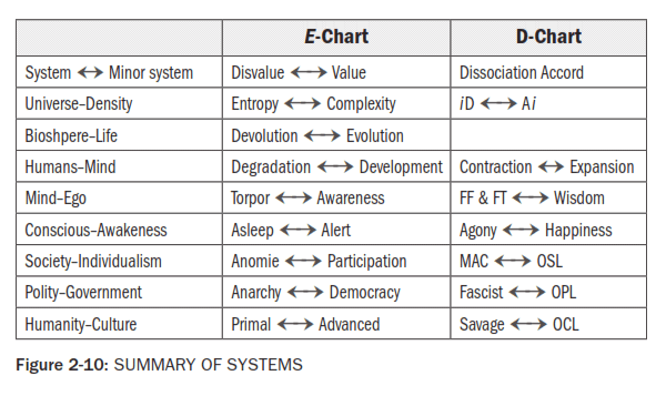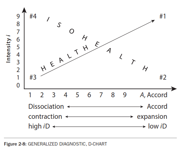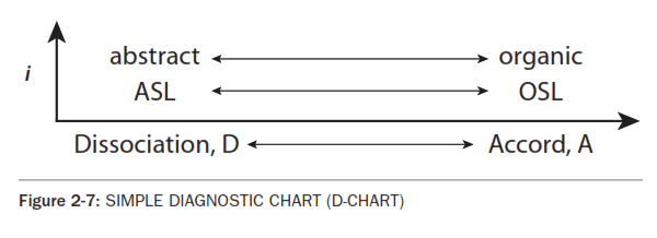 Compare the slant of these ABSTRACT vs ORGANIC E CHARTS. See that the, DIAGNOSIS, D CHART, is derived from EVALUATION, E CHARTS. The left side of the D CHART, Fig. 2-7 represents the dissociated condition of Abstract Social Life shown on the left E CHART, Fig. 2-5. The right side of this D CHART represents the right ORGANIC, or ACCORD E CHART, Fig. 2-6.