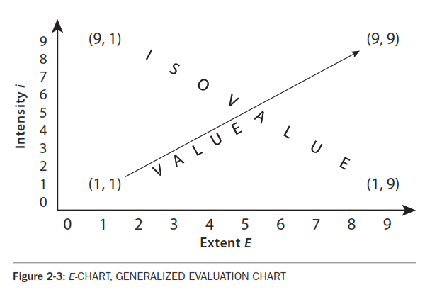 These components, rather randomly chosen as they are, are meant to enhance the image of process, and must be repeated only because the mind tends to trivialize and fixate. Subjective value is discussed, objectively of course, in the Chapter 3, PSYCHOLOGY. Here we refer to the objectivist striving to dissociate the idea of value from personal life, DIPL, p.3. Without DIPL, we are left wallowing in how we feel about something. For the serious work of human ecology and culture design, we need not be trapped in the accidents of our personal psychohistory. Thus, value is the process itself. That's why we call it an "Evaluation chart" instead of a "process chart" - to emphasize this inherent dynamic. It is the machinery of the mind that separates reality's process from its value. Math-like charts may be fun for many, but not for everyone. Charts, like the above E CHART OF EVOLUTION with viruses at the bottom and woman at the top, are intuitively obvious. While using such simple symbols may appear to be artificial science, the scheme is intended to encourage a quantitative mental models. It may be easy to estimate the grains of sand on the beach using a bit of arithmetic, but it is harder to compare the amount of genetic information in the genes of living things, and even more difficult to quantify the amount of interpersonal communication in a culture. The point is, there is always something to measure. If we want to get serious, we don't just mess with words and logic, we get to the business of describing reality as a scientist does, except that we go further and look at the whole scene, not just the specialty. Quantifying Objective Value: OV = E x iEvaluation, then, can be described as complexity, the product of E and i, or V = E x i. The value line, from the E CHART OF EVOLUTION, goes from low Ei to high Ei, low-left to up-right. Similarly, on Fig. 2-2, E CHART OF FROG IN THE UNIVERSE, the subsystems of the frog increase in complexity, all supporting the integrity of Alfred - unless something breaks down. Notice that Alfred at 5,6 has the highest i and E of his component parts, down-left - including the bug he just ate, moving it from his ecofield at 6,4 to his stomach at 4,5. On Alfred's chart, down right, he is supported by his family, his field, his ecosystem and the entire universe. These systems are really part of the greater-Alfred, more than just part of his support system as Alfred-the-thing. They are part of Alfred himself. Alfred, being a Buddhist frog, knows this. Also, the supporting systems all have the same value since they are the same greater Alfred. This line, the Ei of Alfred, might be called the ISO-VALUE LINE, or the same-value line: Ei = Alfred = constant, c. Any system has its isovalue line, Ei = c, as on the next chart, Fig. 2-3. This isovalue line, slopes downward to the right. The value is constant at c: Vc = Ei, as long as Alfred lives. The isovalue lines are like the lines on a relief map in which the altitudes are the same, or on a weather map where the isobar lines indicate the pressure is the same, or on an isothermal map where the temperatures are the same. Reviewing Alfred's plight: if Alfred's pond looses its Ei by drying and becoming a desert, it will have little value for Alfred, and he will die too. Similarly, if Alfred is taken out of his pond and put in a pet shop, he will likely die before he is sold. If all the frogs are so dispatched, by desertification, ozone depletion, or commercialization, the Ei of the entire system degrades. Ecology studies it, culture design fixes it. It may not be easy to keep dynamic images in mind. Alfred is apt to become a mere icon because of the nature of our minds, but this inevitable trivialization and fixation by FF and TT can be alleviated with images based on such a process model. Next, let's generalize the E chart in Fig 2-3, so that we may move toward using it to analyze all other complex systems.