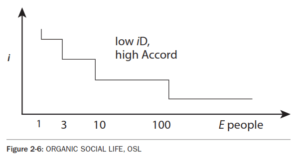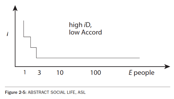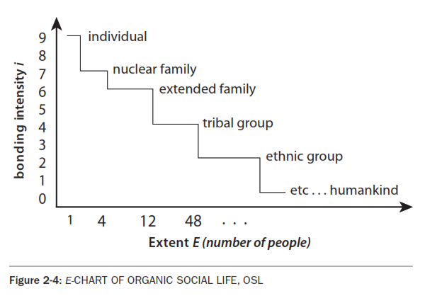 In order to derive the DIAGNOSTIC, D CHARTS that follow, let's look more closely at the E charts. In Fig. 2-4, E CHART of ORGANIC SOCIAL LIFE, OSL, the highest i unit is the individual, supported down the isovalue line by parent or mate in nuclear family, then extended family, clan, tribe, ethnic group, etc., finally to all mankind. Let's omit the meat to the left, the down-left components of the individual. Notice in each step the integration, i, (the bonding) is less, but the number of sub-units, E (that's people), is greater. Simply, we are more attached to those closest to us in space, time and relationship. Keeping DIPL, this simple statement is an objective generalization, it does not refer to our subjective experiences or personal positions. Notice that we do not chart substructure, a simplifying false focus, FF. Modern scientists strive to elaborate the image of the subsystems in animals and plants. Theories of complexity compare the substructure of a branching tree with the substructure of the circulatory and skeletal systems of animals, etc. Let's look only at the gross E and i without regard to the very important substructures, fractals, feedback loops, and other mechanisms of complex systems. In this example, notice the curve can be more or less bumpy: The i step at "individual" represents the i discontinuity between the individual and the family. This individualism, or i Discontinuity, iD, is a favorite variable among different people and different cultures. In New York City, about half of the households have only one person - an iD cliff. This conflict between the individual and society is the grist of much literature, drama and art. In addition, this iD between the individual and her support system changes with time, depending on how the kids wake up that morning. iD Is Where the Action IsOn any E chart, the greater the vertical jump, the greater the action. This i Discontinuity, iD, is the action front of all systems, a crucial point in process theory: The skin of a baby, the relations between people, the surface of the sun, the seashore, the electron cloud of the atom. Imagine examples to illustrate this image: The seashore is the dynamic interface of solid, liquid and gas. Then imagine a tree as the integrator of this solid, liquid and gas. Perhaps we walk in the woods to participate symbolically in this ubiquitous principle, or, more subjectively, to expand our consciousness in the worship of nature, as the ecopsychologists explain. Minor SystemIn any complex system, one subsystem has more i than the others, and this subsystem is the integrating system of the whole. Referring back to Fig. 2-1: E CHART OF EVOLUTION, p.12, notice that the individual is the acme of the universe, a microcosm of the total process, the highest Ei. However, the individual would not exist without the support of the whole, and depends for survival on the (objective) love of the family, the health of the ecosystem, the temperature of the sun, etc. But the controlling Minor System, MS, the individual, has a Life Of its Own, LOO, and tends to dissociate itself from its own support system by increasing its own i! This term 'controlling' implies a power relationship, as in an adversarial culture like ours. We might have used another term, perhaps 'managing' or 'organizing' or 'coordinating'. Such is the human condition, the dynamic of mind, society, and all of reality, as we shall see. Dissociation of the Minor System, DMSLet's call this highest i process a MINOR SYSTEM, MS. The minor system is the coordinating and controlling part of any major system. The other supporting parts we will call "subsystems". Examples of minor systems in their corresponding systems include: the individual in society, the government in polity, the leader in the government, the elite in society, the monopoly in the market, the ego in the Greater Self, GS, the consciousness in the brain, the clergy and laity - even this Process Model in one's broader and deeper perception and world-view. Dissociation is the problem in all complex systems. Let's call this conflict between the minor system and its supporting sub-systems, the Dissociation of the Minor System, DMS. It's so basic in the analysis of complex systems that it requires a special chart, a DIAGNOSTIC or D CHART. D charts are derived from the i bumps the i discontinuities on E charts. D charts measure the DMS, the degree of i dissociation between the organizing minor system and its supporting sub-systems. Pathology and Therapy of SystemsIn social life, the D charts would measure the degree of dissociation, iD, of the individual from the supporting subsystems of family and culture. The Vertical integration, Vi of the minor system with its supporting subsystems is the therapy for all complex systems. Vertical integration is a most basic strategy for culture design, as outlined in later chapters. Of course, modern systems theory has much more to say about the patterns of systems. For example, common ants and bees seem to coordinate with very little MS control. Scientists copy their design in little robots who coordinate without direction. [See SWARM SMARTS by Eric Bonabeau and Guy Theraulaz] The E chart below, Fig 2-5, represents the individual who lives alone, with only thin relationships with family, perhaps a smattering of quasi-family relationships at work, and a few friends and acquaintances. In order to describe this i dissociated life style we are obliged to give it a name. Let's call it "abstract" life, from the Latin origins of that word, "dragged away". He is "dragged away" from a healthy social support system and lives an Abstract Social Life, ASL. (Dr. Laura *Nader, in her lecture THE *TYRANNY OF PERSONAL FREEDOM, uses the term "constructed" rather than our "abstract", perhaps stressing iD's human elements and origins.) The E chart on the right, Fig 2-6, represents a less alienated person, part of a nuclear family at the second step, a network of extended fami