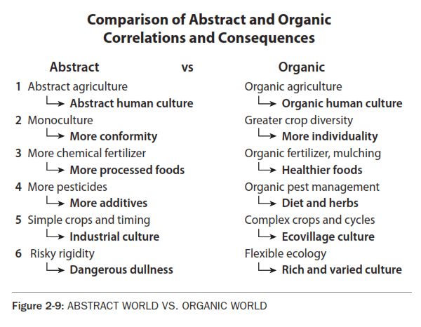 Contraction, Causes and CuresContractions are not all bad. The gift of consciousness itself is a contraction. It has even been called a pathology by philosopher Unamuno. Don't we all feel that way sometimes? But we prefer to call it a gift, and enjoy indulging it occasionally. Consciousness evolved as neural processing expanded its vast mental model ultimately to focus on a train of thought. Let's consider that contractions are caused by stresses or traumas. Imagine the following great dynamics as contractions: The universe seemingly started with the big bang, contracting reality out of nothing. Stars contract out of the firmament. The shock of human consciousness is poetically portrayed as beginning with the fruit of the tree of knowledge, a contractive awareness alienating Adam and Eve from the paradise of organic unity. On an E chart these contractions are up and to the right, but on a D chart they are up and to the left. Birth is a great and tragic separation from the ocean of evolutionary life. Dissociations, inherent in the ebb and flow of contraction and expansion, tend to heal in their own way, especially if they are nurtured in an organic system. Fragility of Contraction, FOCThe greater the contraction, the greater the fragility. FOC is a manifestation of the dissociation of the minor system, DMS. Since contracted minor systems are in greater conflict with their supporting sub-systems, they are in a precarious position. To illustrate and experience this: Remain intensely conscious for several days without sleep. You will observe the fragility of your ego system as it tries to intensify itself without the down-time organic integration of sleep, schizophrenic symptoms. A fragile minor system does not go gently. It's modest demise is the fantasy of a rationalist mind denying the dynamic of systems. Instead it often escalates its own intensity, up left on the Ei chart. As detailed in later chapters, this intensification includes the contracted mind escalating to bullying and schizophrenia, the contracted government escalating to fascism, the contracted economy escalating.... Call this important process, the Dynamic of Escalating Contraction, DEC. Eventually the whole system gets decked, DECed. The Roman empire lasted only half a millennium, but remnants persist as a fragile religion. Humankind's intelligent attention is increasingly important in maintaining *LIFE ON EARTH. It is easy to destroy a forest ecosystem, but almost impossible to build one. "... only God can make a tree. Good intentions are not yet good enough when contracted cultures destroy complex systems. The remaining rain forests, rapidly being ruined, may never recover. This drastic devolution of our ecosystem contributes to the threatening devolution of humanity. It is more efficient to stop the destruction of ecosystems than to try to rebuild after the damage is done. "That intervention is best that intervenes least." The adage that science and technology can fix anything they break is a diabolically distorted denial. Reforestation is welcome, but let's tell the whole truth: Reforestation is often phony because its purpose is not to rebuild a forest ecosystem but to build a more profitable tree farm. Explain this as a difference in Ei as measured by the number of species or any other ecological measure. Be aware that the tree farm as a monoculture is more vulnerable to disease and exhibits the fragility of contraction. It's a FOCed forest. Similarly modern abstract culture can degrade human life and its supporting ecosystem, as explained by human ecologist Paul *Shepard. To reverse this terrible trend requires the responsible application of human intelligence. We cannot expect the hand of God or Gaia to take care of what man degrades. Progress needs both evolution, Ei, and healing, Ai. Human Ecology and Culture Design, the TaskThe illustration of abstract versus organic farming offers a preview of the principles of human ecology and culture design. Like natural ecology, human ecology demands a broader view. The scientist, or objectivist metascientist, is obliged to look at the whole picture and resist the temptation to demand that everything be "perfectly clear". Human ecology is even more complex than natural ecology, but the demands are similar. "We must look forward to great tomorrows." Summary of SystemsIn the summary of systems below, the left column is the GREATER SYSTEM, to the right is its controlling MINOR SYSTEM. The E CHART measures the value from left to right. The D CHART measures its health from DISSOCIATION to ACCORD. Notice these are not dichotomies but parameters, measures to compare systems and subsystems, ala *Kosco.