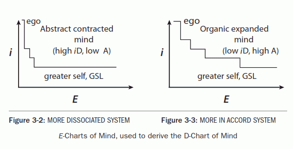The contracted mind, represented on the left chart is intense but has a very narrow base. It's more rational, highly dissociated from its own subconscious support system and more alienated from its own intuition. The expanded mind on the right has a broader base. It's is more intuitive, and has easier access to subconscious integrations, disclosures, and syntheses. Many theories explain this as rational vs. intuitive, right brain vs. left, verbal vs perceptive. [essay????] The more organic mind is healthier than the abstract mind because it is more i integrated with its own subconscious. Thus the D chart can be called a "health" as well as a "diagnosis" chart. In any D-A Chart, we call it "dissociated" when considering the D side and "health" when attending to the Accord side.