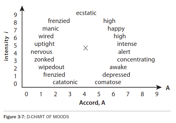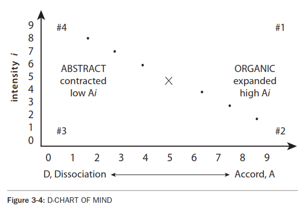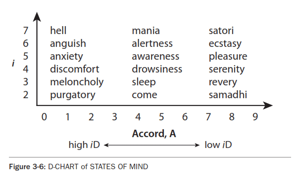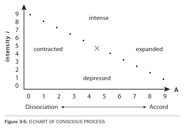 Imagine your most common mood at x, the center at 5,5. Becoming more alert would be an arrow upward, to 5,6 and 5,7. Contractive alertness, like a coffee jag, is upwards but left of the isohealth line, toward 3,6 and 2,7. At the same level of alertness, i5, an anxiety state would be to the left, toward 3,5 and 2,5. Mellow would be toward the right, expanded toward 6,5 and 7,5. Sleep is not a simple state, but it wanders down the isohealth line just below the level of awareness, perhaps i2, in and out of the REM dream state, etc. Let's use the D chart to classify and compare the i intensity and the D-A dissociation of various states of mind.