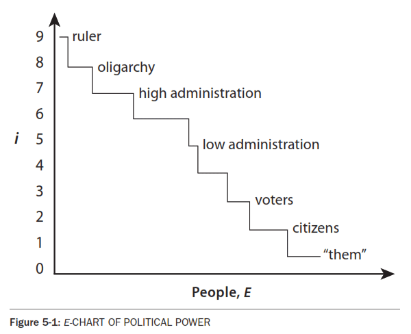 The ruler, whatever she is called, is the person with the highest I, - could be the president's husband, or his wife as in the case of Nancy Reagan, or Vice President Cheney. Notice this E chart does not include such items as President Kennedy's Addison's disease with the required dose of cortisone as an important factor in his political decision making. This is only a tool, not a truth. The oligarchy step may have more or less power, I, and also more or fewer people, E. The jagged line represents any particular political system down through the regional governments to neighborhood organizations, if any. Each level has an I bump of less power than the one above. This same analysis can be used to draw a curve depicting the United Nations or small music clubs. For practice, contrast the political power structure of a string quartet with a symphony orchestra on the E chart. Any political system or subsystem can be described by the jagged line. The bottom of the line, 8,1, is the total population, E, that part of the polity sometimes called `citizenry', `subjects' or `masses'. In similar E charts, the E might refer to larger groups, such as Gerrymandered districts in a legislature, or nation-states in the United Nations. Reluctant ReductionismsReviewing from Chapter I: notice that the E chart does not represent the `substructure' in any of these broad categories. It makes no differentiation among the overlapping organisms of government, business, associations, religions, etc., but lumps them together. Most often they coordinate power closely with each other, making this oversimplification more tolerable. The circle-and-arrow charts common with systems analysts helps to visualize that. Since this chart has only two dimensions, this simplification may imply to the neophyte that political systems are simpler than they really are. Another distortion of this example is the narrow focus on the nation state, ignoring the integrative functions of the international organizations such as the multinational corporations, the International Monetary Fund, the Gang of Seven or Eight or Nine, Interpol, the United Nations, etc.. Imagine the Global Economy, GE - pronounced as in "gee whiz" - as the subsystem most in charge of controlling the ecopolitical process of humanity. GE is the controlling minor system, MS. [GLOBAL ECONOMY, GE and notes on Appiah, Barnet, Brecher, Dicken, Gates, Morrison, Sale, Thurow, and Vazquez - and many current sources.] Alas, such reductionism is essential given the nature of mind. We can only continue, acknowledge the problem and courageously proceed with the objectivist task. Visual AidsOther charts different from these E and D charts are often used to display relationships in political systems. For example, many civics books describe the branches of government, their authority and feedback relationships with block-style charts, with lines to indicate the relationships. These civics charts often resemble E charts, with the power at the top and authority dribbling downward. Similarly, political anthropologist use labeled circles and arrows to picture the flow of money from the corporations through the lobbyists to the elected representatives and its feedback to `supply-side' incentives. Psychologists use similar sociograms to represent communications in groups such as congressional committees, classrooms or squads. Such simplifications, necessary as they are to our DIM human minds, need not discourage us or dissuade us from proceeding, objectively. Burdens Of Rationalism - Idealism, BORsResistance to using Chart analysis of political process derives from several sources. The rationalist-idealist, RIDs tradition, prefers words that refer to words, not to words describing operating processes. They ask, "What do you mean exactly, what is the definition of this term?", thereby discounting this intellectual tool. Have sympathy for their retreat from infinite complexity into the DIM demands of mind. This peculiar activity called `verbal proof' may be a hangover from our history. Worse yet, it goes back to the beginning and rests on the basic nature of mind as an information processing machine. Succumbing to this DIM demand, the RIDs focus on the formal aspects of politics, often avoiding what goes on under the table, unless it makes good copy. A more anthropological and psychological view might even be considered disloyal, or at least abstruse, a threat to the verbal belief systems at the core of RIDs' DIM life. More expansive and inclusive views threaten a contracted ideology. That threat is roughly proportional to the amount of stress in the culture, analogous to the fragility of the mentally ill. Thus, political fragility is another example of the fragility of contraction, FOC. In the more contracted mode, people may try to protect their integrity from this threat. The contracted RIDs escalate their contraction, according to the principle of the Dynamic of Escalating Contraction, DEC, as we see with our neocons. The RIDly alleviation of this pain, projects authoritarianism into intellectualism as a way of escaping distressful analysis. Objectivist analysis must not be used as an excuse to fixate on mere words, nor to express either loyalty or disdain. These popular subjectivist indulgences may be common, but they are little help in describing things deeply, or in developing healthy discourse. Similarly, the objectivist must be careful and polite lest the whole effort be rejected or condemned, and the participants jailed or audited. Let this author's mild and modest approach serve as an example. Subjective awareness does not necessarily describe the objective political relationships. If we limit objective analysis to what people say they think they feel, we are in a sorry state, as described in FOCUS GROUPS, FOGS. To accept people's primitive ideas of politics as objective would degrade analysis. Politics, like much of life, is subconscious, with occasional partial awareness. The se