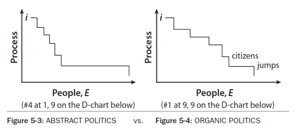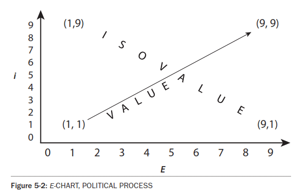 Down-right is the isovalue line. As the number of cars increases, but the highways do not increase enough, there is no net increase in value and transportation is not improved. Using this chart, imagine the representation of gridlock, or better public transport. These examples take the lite approach, postponing such subjects as the Nazis and the current U.S. administration until we gain more mental strength and courage. In modern culture, political evolution must respond to the complexity of modern society. Adequacy of government, an E chart measure of value, includes the provision of basic necessities and quality of life. Consider political adequacy as a quantity, measured in many ways by political scientists and others. President Franklin D. Roosevelt formulated these basic human needs as freedom of speech and religion, and freedom from want and fear. [The "Four Freedoms" were Franklin D. Roosevelt's formulation for the nation and the world in his State of the Union Address on January 6, 1941, just before what Studs *Terkle describes as THE LAST GOOD WAR.] If government is not Ei adequate, socio-economic subsystems (you name them) may become minor systems and lord it over everyone else. For example, drug companies and other medical businesses have make U. S. medical every expensive while health care deteriorates. Review the Dissociation of the Minor System in Chapter 2. [NOTAM, Notes On The Anthropology of Medicine.] E Chart of GovernmentsLet's refer to the basic theory in Chapter 2, abstracting objective value. The up-right direction can represent the adequacy of government to manage humankind and its sustaining ecosystem. Imagine current governments at 5,5 center, barely able to get by, sorely inadequate to the tasks at hand. Worse than this simple lack of value: humankind's energies and Earth's resources are pathologically engaged in brutish wars and rapacious competitions, as depicted by the Diagnosis charts later in this chapter. Practicing Political ValuePolitical evolution, like the evolution of life, is represented on an E chart by the line moving up right, the direction of positive value, toward (9,9): more people, E, times more integration, i, as in Fig 5-1, . For practice charting political process, let's measure the number of people, E, times their interactions, i, by placing some political system in the center of an E chart. A simple increase in number of people would be a movement to the right on the E scale; and an increase in the integration, interdependence, or intensity of their relationships would be a movement upward on the i scale. A political party that gets elected goes up and to the right. Up-right is the direction of positive value: as the population increases, E, the supporting integrative systems, i, increase toward (9,9). For example, as world population increases, the supply of food also increases. Increasing population moves to the right as when people, E, from world over visit the United States when pregnant so that their offspring might have the birth certificate of empire. If the ruler gains more influence, her point on the line moves upward to 1,10. Any level of the political structure, state governments at 3,7 for example, can bulge to describe changes in E and i. Political breakdown would be downward, i, such as when the trains don't run on time, the prisons are not safe, people lack food, clothing or shelter, and the ecosystem degrades. However if the population increases but the organization does not, they follow the curve downward to the right, the iso-value curve. If i increases, an improvement of transportation for example, they move up right, the positive value curve. In the modern world the burgeoning technology accelerates political evolution, or devolution. Political evolution "allows but does not compel" dissociation from the supporting ecosystem. It seems to work out that way, not because of the technology, but because of the pathology, the compulsion to the abstract life, CAL. Political Ei, value without regard to dissociations, can make life better and richer for everyone, or sicker and poorer for many, as we so often see. The classic issues of the individual vs the society, the problems of war, exploitation, degradation by modern abstract culture, MAC - all these are not simply E Chart value problems. These are Dissociation problems to be diagnosed on the D Chart, explained in the next section. Political Pathology - D Chart of Political ProcessIn all complex systems, the i discontinuity is where the action is (iD). This action, from Fig 5-3, is the i step from the individual up to the political unit. All complex systems are in dynamic conflict between the controlling minor system, and its supporting subsystems. All governments manifest this dissociation of the minor system, DMS . In politics, DMS includes the government vs the people, the individual vs the society, the powerful few vs the powerless many. These dissociations devolve into the warrior vs the producer, the victor vs the vanquished, the establishment vs the interloper, the creditor vs the debtor, the rich vs the poor, etc. Now and throughout history DMS is the basic dynamic, between the left Ei chart and the right Ei chart below. On the E charts below, the high D curve on the left is referred to as `abstract' - it's a more dissociated system. The high A curve on the right is described as `organic' - It has a more gradual curve of political subprocess support systems. It's more complex. Abstract refers to the steep line, with a minimum of intermediary process, between the governors and the people. Call it Abstract Political Life, APL, loosely called `authoritarian'. Organic refers to the more gradually sloping line with graduated and overlapping subgroups from the top to the bottom of the political system, Organic Political Life, OPL, very loosely called `democratic'. [QUANDEM, Quantification of Democracy] Organic politics is like organic gardening: add compost to the grass r
