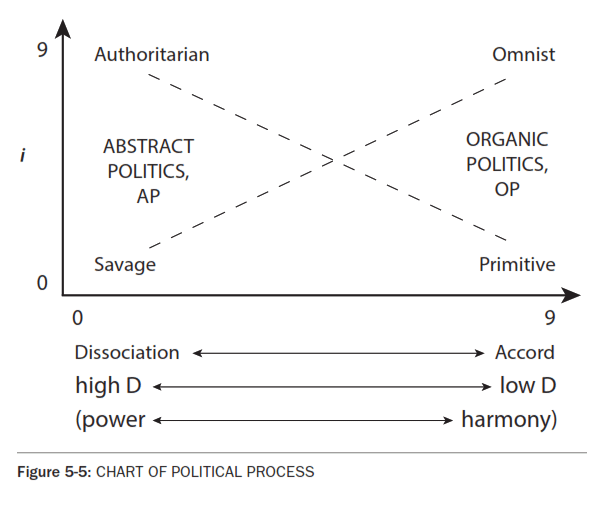 The i scale measures the intensity, integration or organization of the system. A measures the amount of organic process, and its opposite, D. We can use the words `power' and `harmony', since high D measures pressure and conflict of dissociation, whereas high A represents more cooperation and accord. Let's use the new word `omnist' to refer to the high Ai condition. It derives from the Latin word for `all'. This word `omnist' means all-encompassing and totally responsible. Since humans are the highest Ei valued system, omnist also means concern for privacy and freedom of the individual, supported by government and culture. (We wanted to use the word `democracy', but it's been ruined.) Such `total' concern and responsibility might be named `totalitarian', but unfortunately that term is already in common usage. `Totalitarian' commonly means `authoritarian', perhaps because our RIDly intellectual culture sees responsibility as pushing people around rather than structuring for cultural enrichment. Omnism avoids this problem by stressing that citizens personal security and development rests upon the protection and support of the general culture by government. (Later, this is a crucial issue in Chapter 9, EDUCATION) To some folks, omnism looks like authoritarianism. People are understandably worried that political power is inherently limiting to `freedom'. The compulsion to the abstract life and its resulting modern abstract culture offer many examples of this threat. An omnist culture that expresses deeper freedom doesn't just survive and grow by itself. The expansion of personal freedom in organic political life and culture needs protection and planning by culture design. Practicing DiagnosisTo practice this D chart analysis, consider the D-A parameter between these two extremes, from `abstract politics' to `organic politics'. Select a nation and describe which processes illustrate organic political life and which typify abstract politics. For example, take two otherwise similar nation-states and compare their various abstract and organic components: in U. S. and Britain, the executive branches. Imagine why the British constitution is not written. Perhaps the British prefer the flexibility of a less written constitution and a lower i for the chief executive. This might be a reaction against continental Cartesian rationalism, or an assertion of organic process against RIDs. On a lower level of political life, compare drug war programs based on punishment to those based on therapy, a D-A parameter. [L. L. Whyte calls it the "Western dissociation".] Our concern quickly broadens to include cultural aspects not usually considered political. Broader scope is an `intellectual' as opposed to a `rational' practice, inherent in the `objectivist' rather than the `idealist', view of politics. The problem of reductionism burdens any discussion: Simple information, such as income distribution or voting rights, is easy to measure, and therefore tends to displace broader measures of the quality of political life. (Anthropologist Laura Nader in one study measured the quality of life by details such as the consumption of cut flowers and the amount of vacation time - a good-natured reductionism.) Concerns beyond welfare and security include identification with the greater group, meaningful ceremony, and participation in community projects, essentially `quasi-tribal process', QTP. Stuck with this reductionism, the contracted mind of RIDLY thinking reduces the vast human complex of Ei values toward narrow pursuit of wealth, simplistic patriotic images, and `gross' national product. "Gross" - in common parlance among the young - means crude and unpleasant. In economics, GNP, Gross National Product, is the total of goods and services produced, a distorting measure by the Commerce Department - but "growth" is not so simple. Practice D Charts of PoliticsTo practice further, let's quantify organic political life on the D charts. What can be measured? Imagine a simple political representation: the absolute dictator would be on the high D side, an organic representative structure on the high A side. But look more closely and more anthropologically. In contrasting systems, how does the abstractness of an alienated electorate compare with the organic processes of a benevolent monarchy? The most basic D-A measure in political diagnosis is the Power-Harmony parameter, PH, . For practice, analyze the most power-oriented political cultures. Nazi Germany comes to mind is a classic analysis of authoritarianism as it permeates politics, personality and culture. See the classic by *Adorno, THE *AUTHORITARIAN PERSONALITY, and *Fisher *AFTER THE FALL, Germany, the Germans, and the Burdens of History. "Fisher confirms all the cliches of a pushy, intolerant, rule-abiding, power-loving, deferential German. ... The sum of his observations supports the ongoing German project of demonizing all aspects of East German life and history, including the very idea of socialism....". Many more modern works study this issue in depth. Rafael *Ezekiel's THE *RACIST MIND, Portraits of Aryan Nation and Racist Mind, finds most such young men have lost a parent, especially a father, early in life. They need reconstructed organic social life, ROSL, perhaps more than most. Within each political culture is an infinite complexity and dynamic. Each aspect can be analyzed for its power-harmony, PH. The Bill of Rights, for example, attempts to guarantee minimum security to all citizens - a level playing field in a bitter battle. The democrat tries to organize people to exercise power over their government. The omnist seeks to diffuse the power throughout the culture in the organic manner, OG. [LETS PARTY] Pathologies of PoliticsLet's consider using the D chart image by suggesting various dissociations. One dissociation is the split between the managers and the "frames". For example, how do the frames of reference in common political discourse diverge from th
